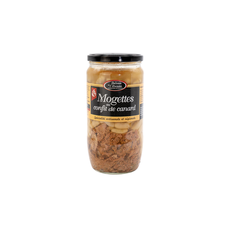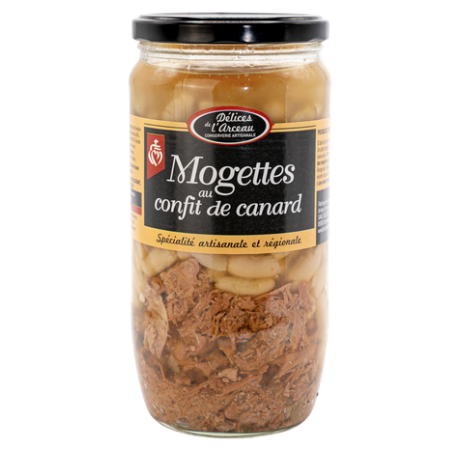 Mogettes de Vendée IGP Label Rouge blanchies 40% , eau, confit de canard 20% (viande de canard, graisse de porc et de canard), aromates, sel de Noirmoutier, épices.